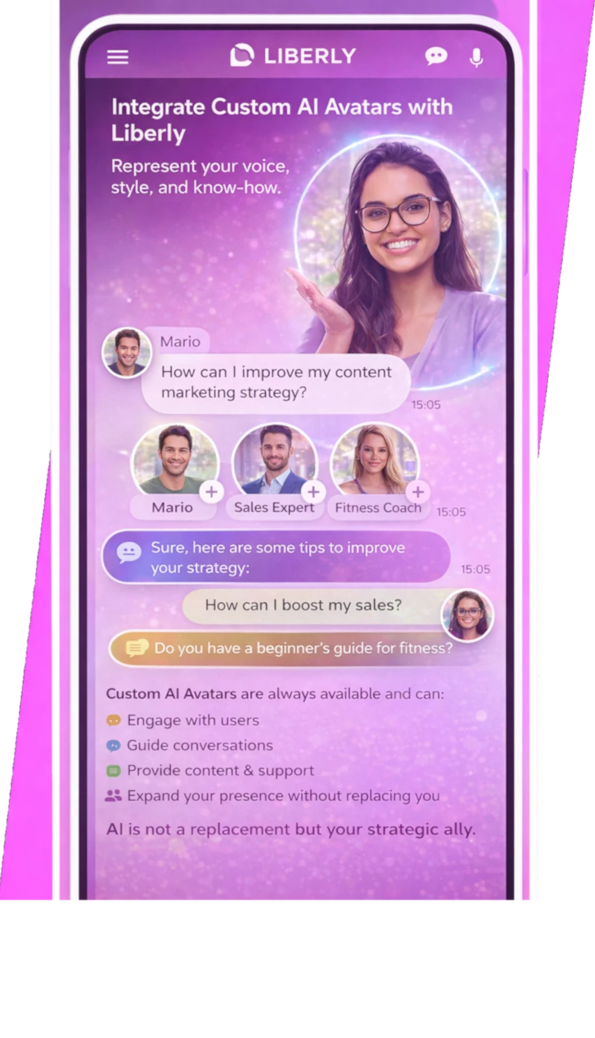 Con Liberly puoi integrare Avatar AI personalizzati che rappresentano la tua voce, il tuo stile e il tuo know-how.
